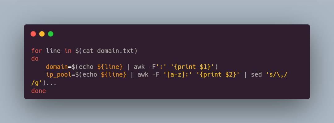 首先我们对 domain.txt 中的内容进行循环遍历,提取出域名和 ip 池。