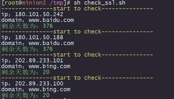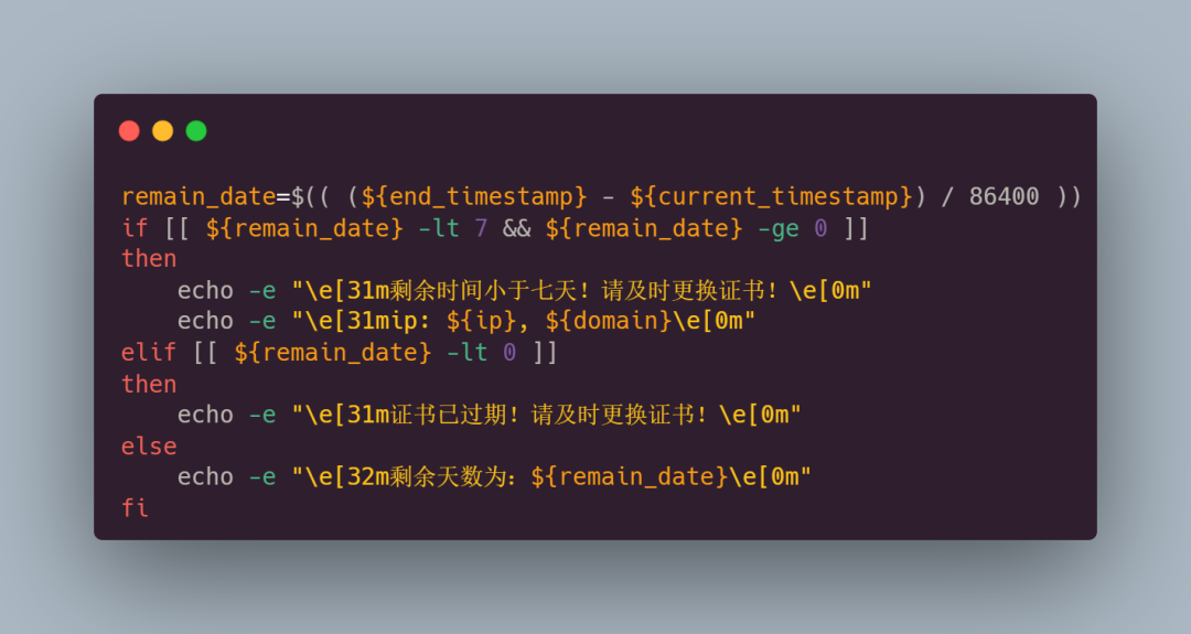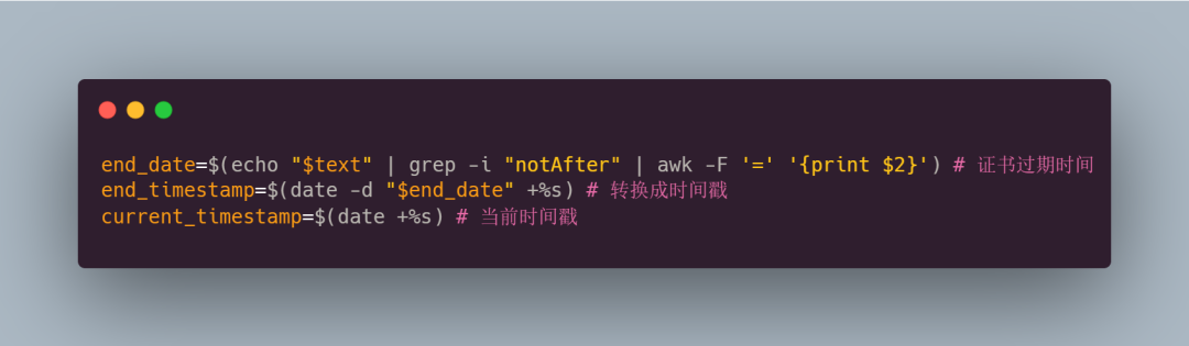 然后我们提取出输出的 SSL 证书信息中 notAfter 的值,然后转换成时间戳的形式,并且求出当前的时间戳。