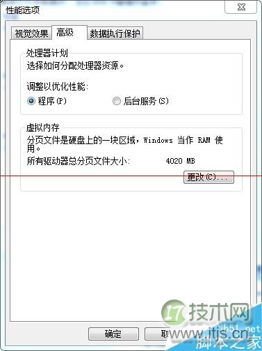 6、在“高级”选项卡中,列出了处理器计划和虚拟内存的大小。通过选中“程序”和“后台服务”单选按钮,可以更改处理器计划;通过单击“更改”按钮可以修改虚拟内存的大小。