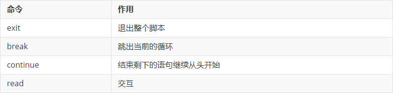 #!/bin/sh for i in `seq 5` do user=oldboy$i id $user &>/dev/null if [ $? -eq 0 ];then exit else useradd $user &>/dev/null [ $? -eq 0 ] && echo "$user 创建成功" fi donebreak创建完oldboy5用户 跳出本层循环继续往下执行 创建5个用户