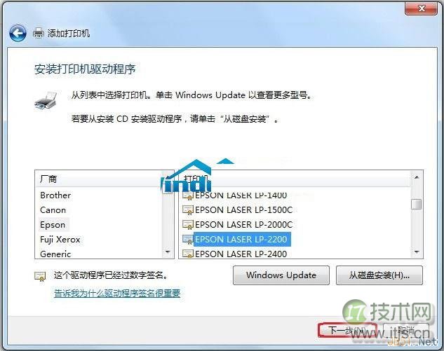 4、加打教程此页面需要选择打印机的印机“厂商”和“打印机类型”进行驱动加载,例如“EPSON LP-2200打印机”,云服务器提供商图文选择完成后点击“下一步”。注:假如Windows 7系统在列表中没有您打印机的类型,可以“从磁盘安装”添加打印机驱动。或点击“Windows Update”按钮,然后等待 Windows联网 检查其他驱动程序。