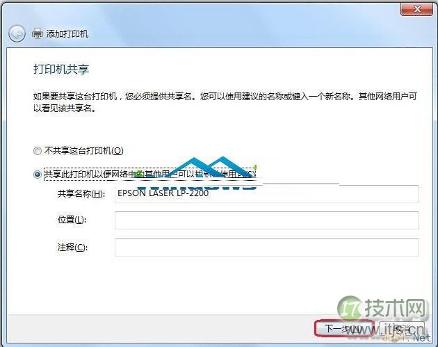 6、打印机驱动加载完成后,系统会出现是否共享打印机的界面,源码库您可以选择“不共享这台打印机”或“共享此打印机以便网络中的其它用户可以找到并使用它”。假如选择共享此打印机,需要设置共享打印机名称。