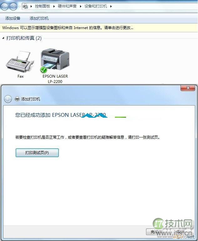 7、点击“下一步”,添加打印机完成,设备处会显示所添加的打印机。您可以通过“打印测试页”检测设备是否可以正常使用。