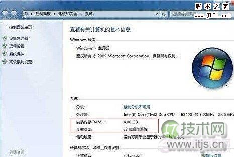 最后重新启动计算机,在选择我的电脑属性后,内存被识别成4GB容量,如下图所示。