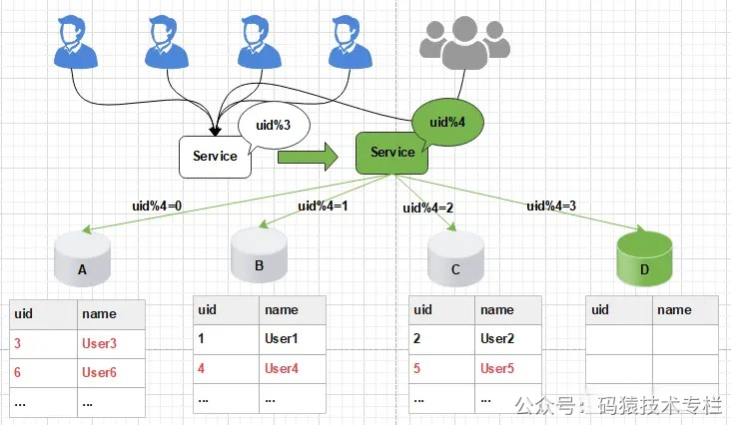 比如之前uid如果是uid=3取模3%3=0, 是分配在A库上,新加入D库后, uid=3取模3%4=3,分配在D库上;