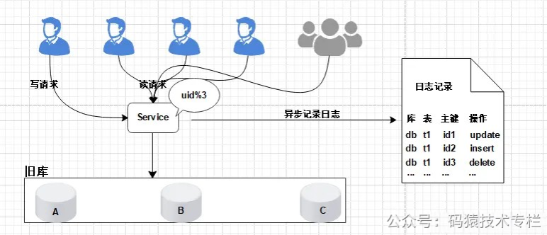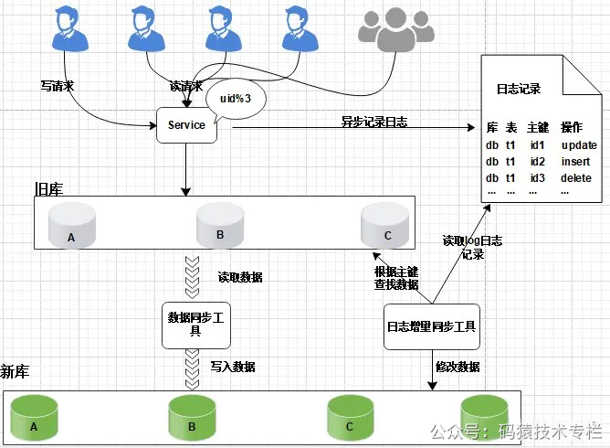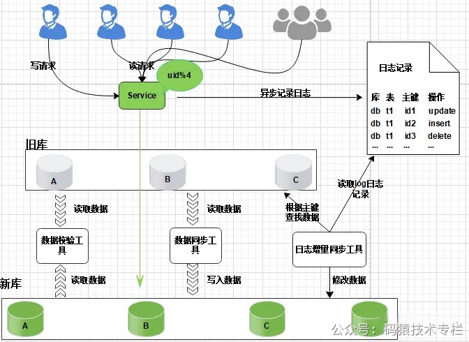 只对旧库进行读取操作, 如果同步出现问题, 都可以对新库进行回滚操作。