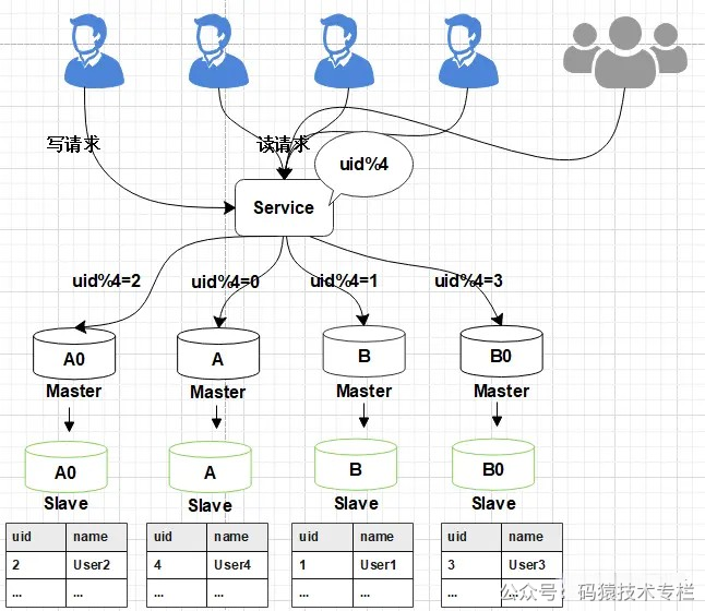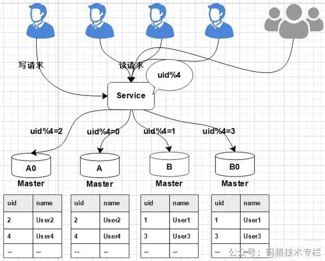 把uid%4=0和uid%4=2的数据分别分配到A和A0主库中