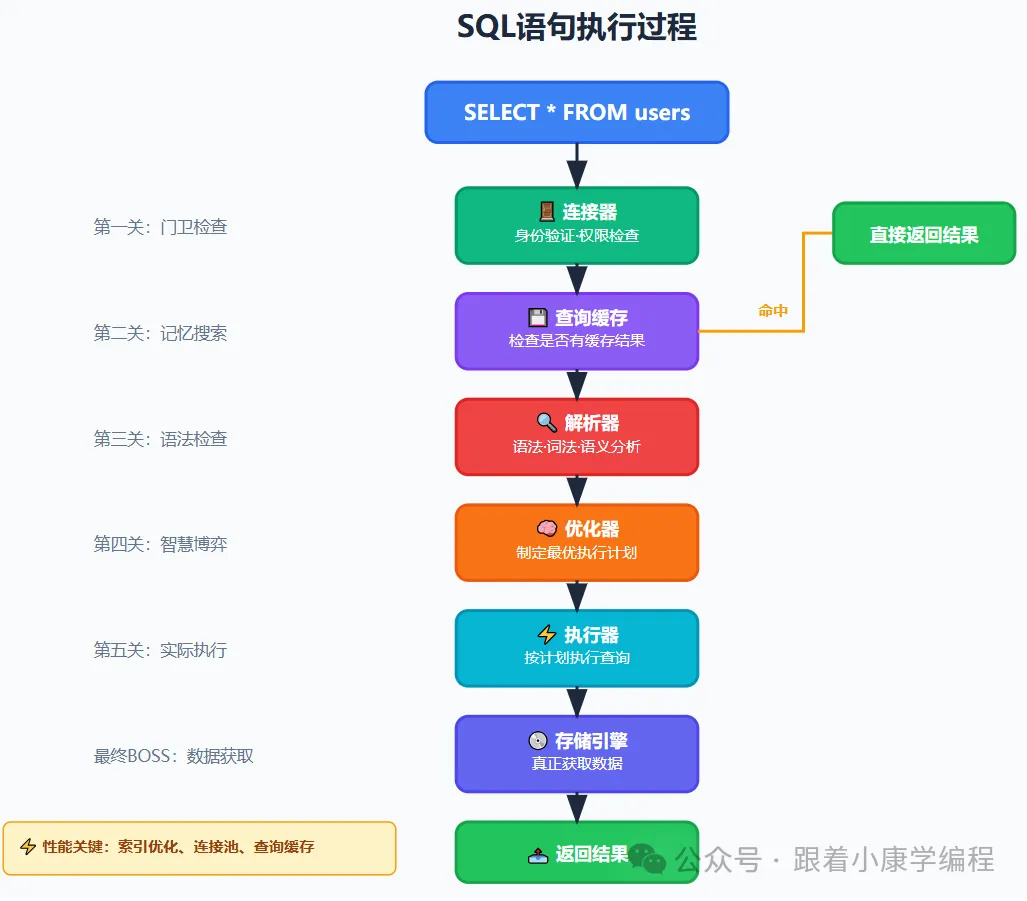 复制-- ❌ 死亡分页 SELECT * FROM users LIMIT 1000000, 10; -- ✅ 游标分页 SELECT * FROM users WHERE id > 1000000 LIMIT 10;1.2.3.4.5. 彩蛋:一张图看懂SQL执行全过程 复制你的SQL语句 ⬇️ 🚪 连接器:身份验证 ⬇️ 💾 查询缓存:有现成答案吗? ⬇️ 🔍 解析器:语法检查 ⬇️ 🧠 优化器:制定最优方案 ⬇️ ⚡ 执行器:执行计划 ⬇️ 💿 存储引擎:真正拿数据 ⬇️ 📤 返回结果给你1.2.3.4.5.6.7.8.9.10.11.12.13.14.15. 写在最后的话下次当你写SQL的时候,记住:你不是在写代码,你是在指挥一场复杂的"数据库交响乐"!