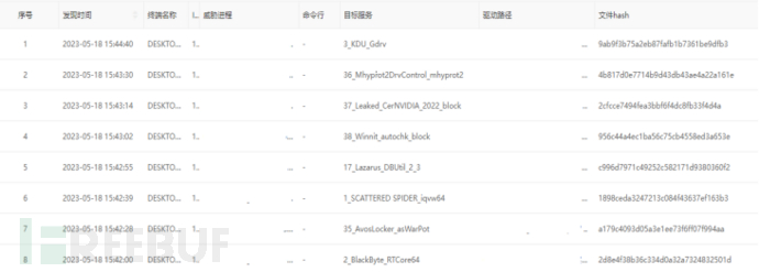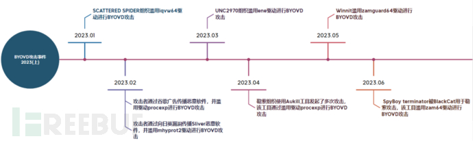 下图展示了自23年以来包含BYOVD利用的胁防攻击事件,从图中可以看出这项技术正广泛运用于APT、景追勒索在内的踪威各项攻击活动。