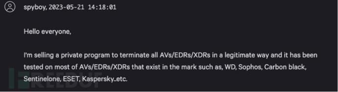 另一方面,LockBit的确在22年11月的勒索攻击中直接合入了Backstab开源工具,同样被勒索组织合入的BYOVD利用工具还有SpyBoy Terminator,该工具于5月下旬在网上公开售卖,后被BlackCat用于真实的勒索攻击。