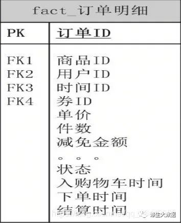 涉及到事实表为订单表、订单明细表,维度包括商品维度、用户维度、商家维度、区域维 度、时间维度。