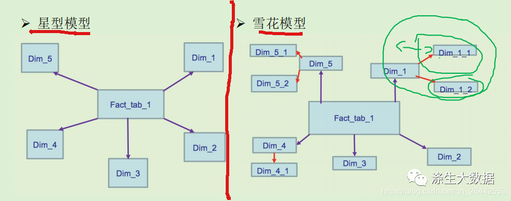 1)ER模型常用于OLTP数据库建模,应用到构建数仓时更偏重数据整合,站在企业整体考虑,将各个系统的数据按相似性一致性、合并处理,为数据分析、决策服务,但并不便于直接用来支持分析。