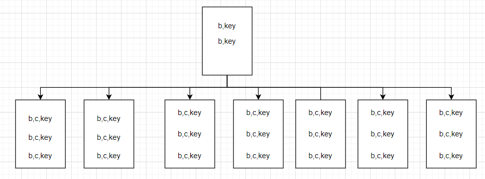 1.2.3.4.5.6.7.8.9.10.11.12.13.14.15.16.17.18.19.20.21.从叶子节点上看,也是 (b,c,key) 的布局模式,这时候脑子里就有了一张图。