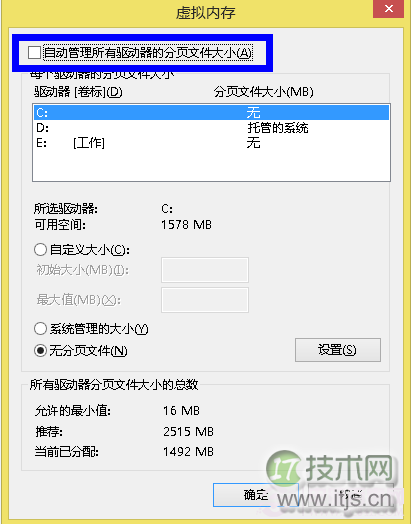 五、接下来我们就可以对虚拟内存的大小进行设置了。先取消“自动管理所有驱动器分页文件大小”前面的小勾,如图所示