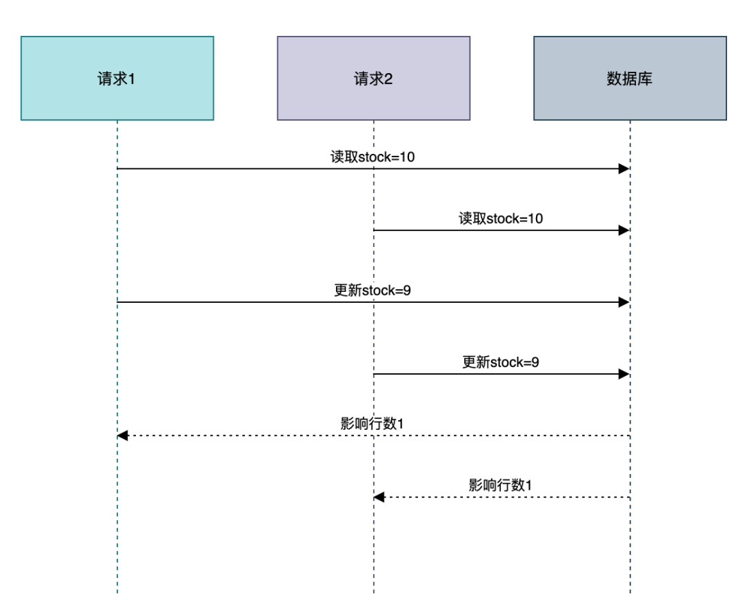 复制-- 危险的商品更新语句 UPDATE product SET stock = stock -1 WHERE id=123 AND stock>0;1.2.3.上面这条看似安全的SQL,在并发场景下可能变成下图这样的超卖: