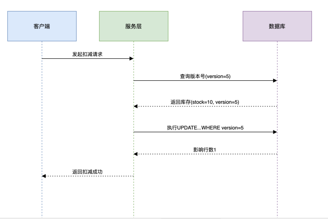 复制@Transactional public boolean deductStock(Long productId) { Product product = productDao.selectForUpdate(productId); if (product.getStock() <= 0) return false; int affected = productDao.updateWithVersion( productId, product.getVersion(), product.getStock()-1 ); return affected > 0; }1.2.3.4.5.6.7.8.9.10.11.12.基于数据库乐观锁方案的架构图如下: