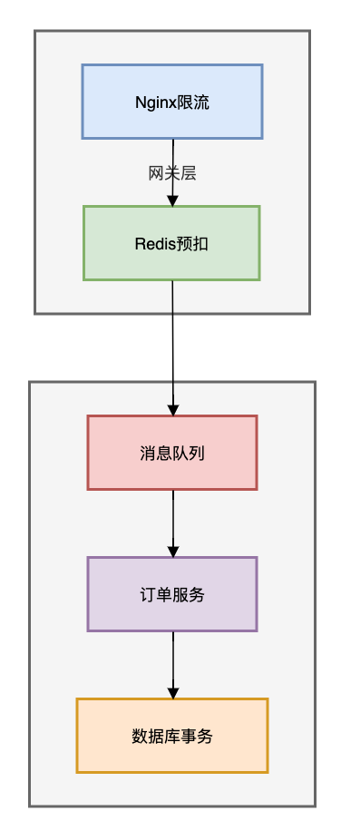 复制// Guava RateLimiter限流 RateLimiter limiter = RateLimiter.create(1000); // 每秒1000个令牌 public boolean preDeduct(Long itemId) { if (!limiter.tryAcquire()) return false; // 写入预扣库存表 preStockDao.insert(itemId, userId); return true; }1.2.3.4.5.6.7.8.9.10.该方案的架构图如下: