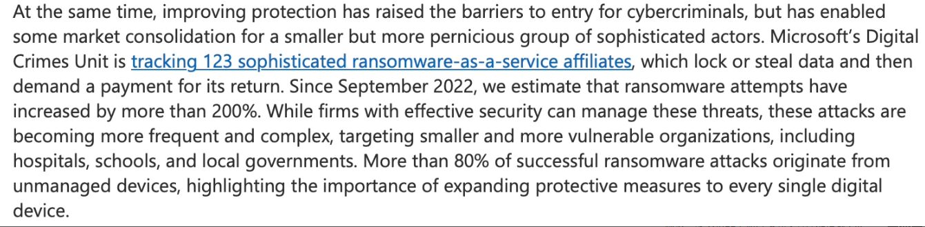 根据微软的统计,过去两年有 40%“国家级黑客”的攻击行动主要锁定了重大基础设施,例如电网、供水系统或医疗机构等,这些行业的服务中断,服务器托管会带来可怕的后果;而微软所追踪的 123 个“勒索软件即服务”的黑客团队,自去年 9 月以来的攻击次数增加了 200% 以上。