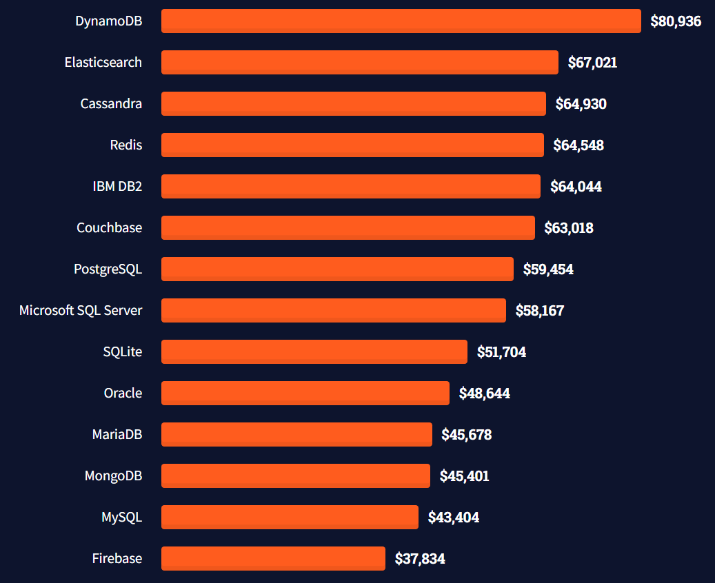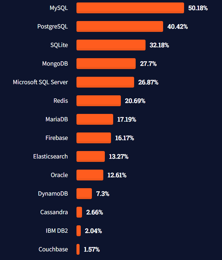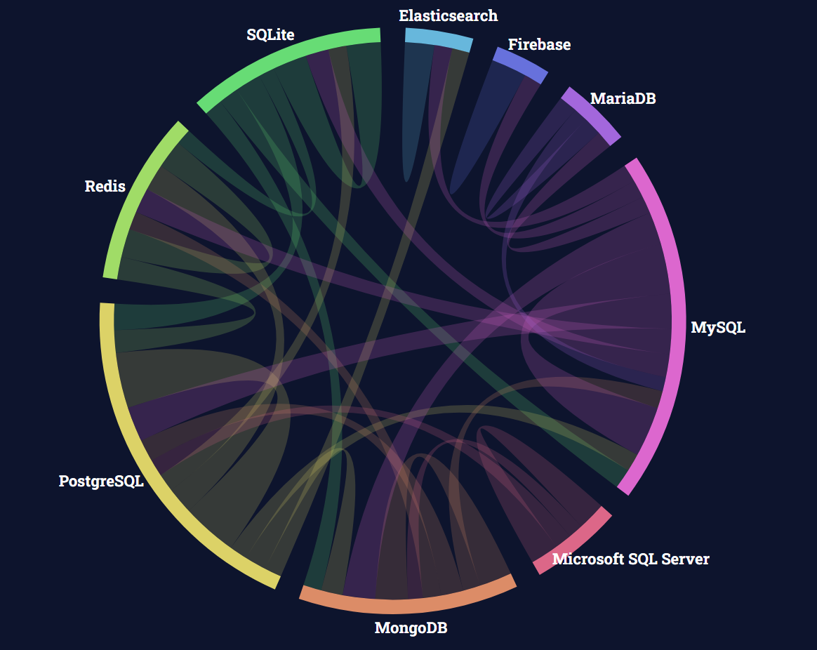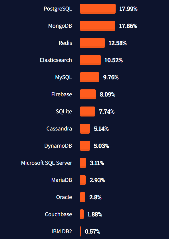 可以看到,Stack Overflow 的调查结果和 DBEngine 的排名不太一样。在此次调查中,新兴的 PostgreSQL 和 MongoDB 十分受欢迎,两者的排名分别是第二和第四名,PostgreSQL 的受欢迎程度仅次于 MySQL。