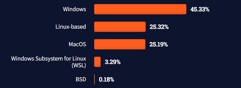 这次调查首次将 WSL 独立出来进行统计,可以看到选择 WSL 作为开发平台的受访者占了不少的比例。