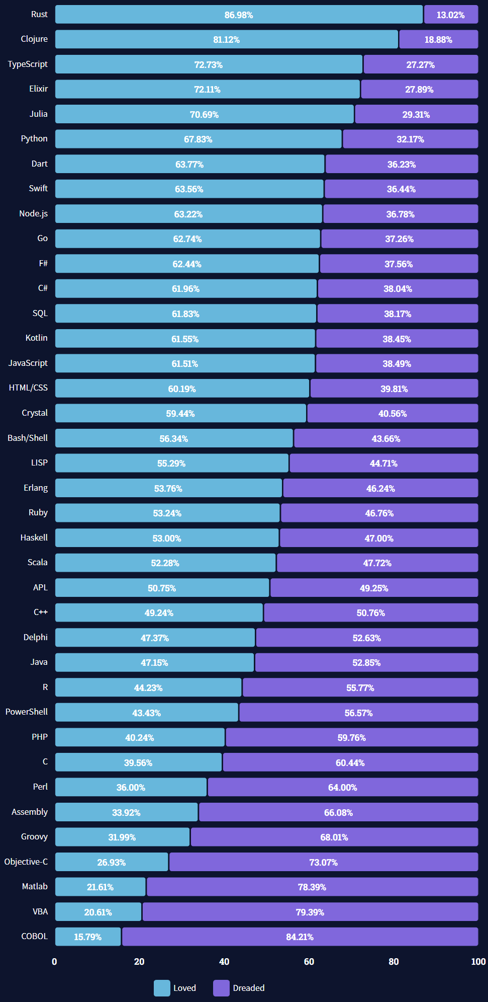 您的当前位置:首页 >域名 >Stack Overflow 最新开发者调查报告:Rust 最受喜爱、PostgreSQL 最受欢迎 正文