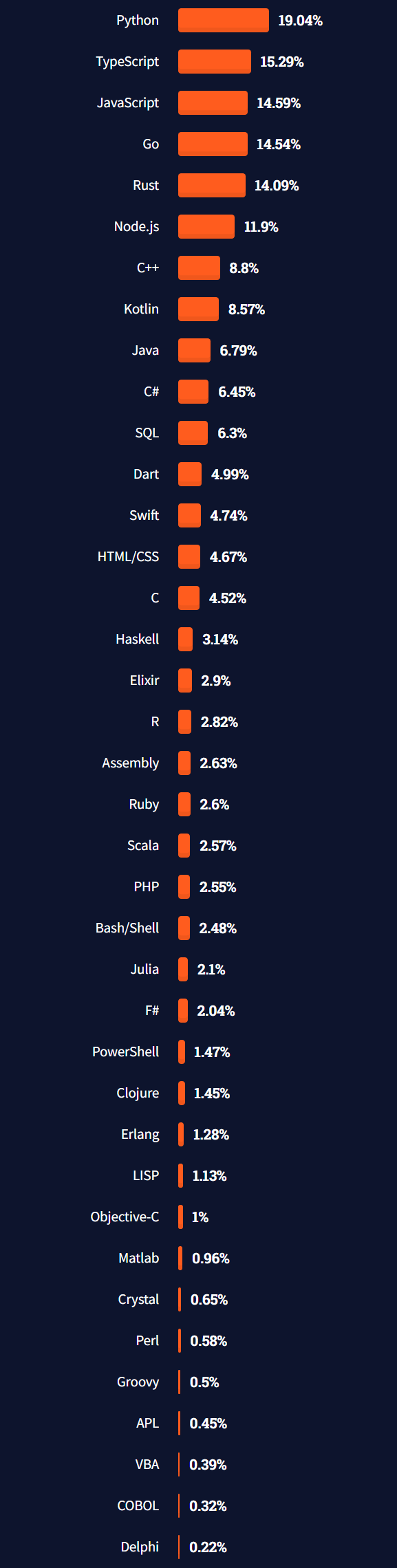 调查结果显示,Rust 是最受开发者喜爱的语言,Python 和 Typescript 是开发者最想使用的语言(前提是还没使用过)。