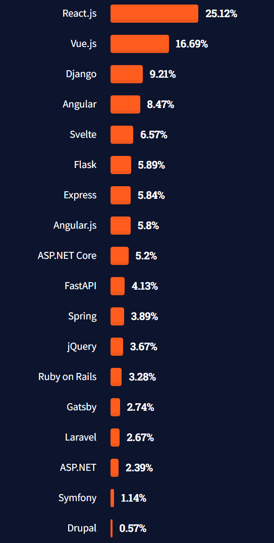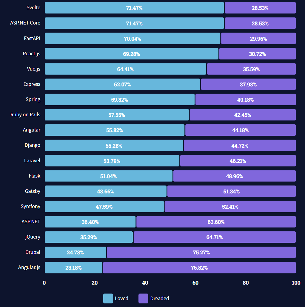 新兴的 Svelte 框架占据了最受喜爱的框架的首位,React.js 也十分受欢迎,有四分之一的开发者希望学习此框架。