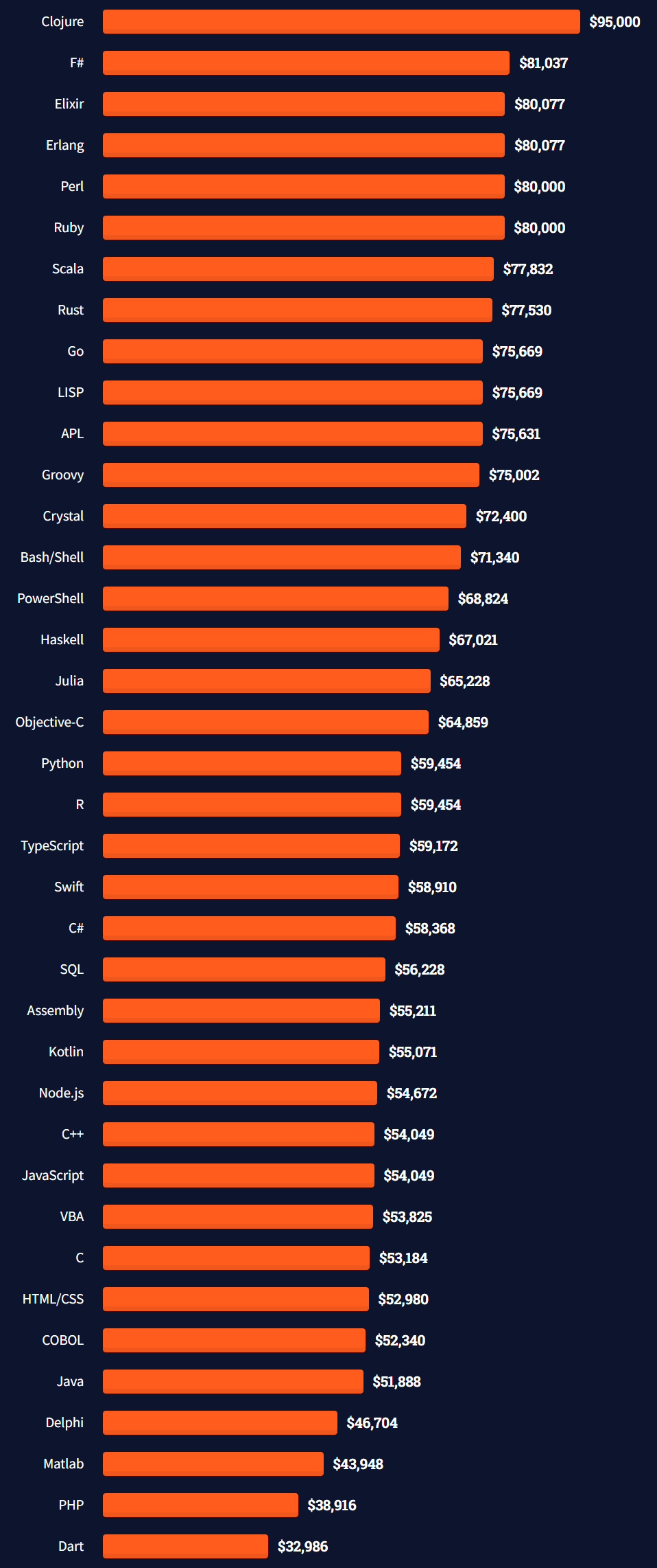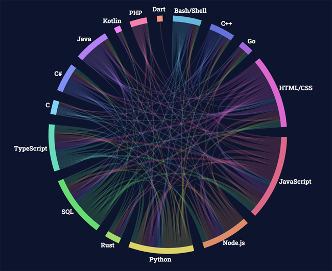 这里的调查结果有很多东西值得解读,以下是一些最值得注意的趋势。有超过 1 万名 Javascript 开发者希望开始(继续)使用 Go 或 Rust 进行开发。大多数想使用 Dart 的开发者目前都在使用 JavaScript。此外,想用 PHP 工作的开发者只有 SQL 开发人员。