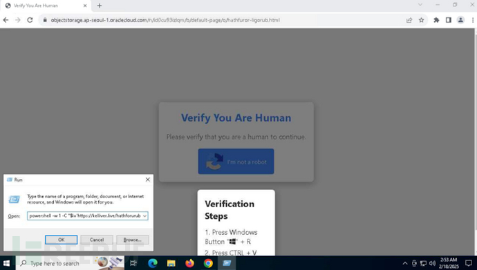 这些PDF文件中包含的虚假验证码图像,既可以作为窃取信用卡信息的工具,也可以作为下载恶意文档的诱饵。点击这些图像后,受害者会被重定向到一个伪装成验证码验证页面的恶意网站,该网站利用ClickFix技术诱骗受害者运行一个MSHTA命令,通过PowerShell脚本执行窃取程序。