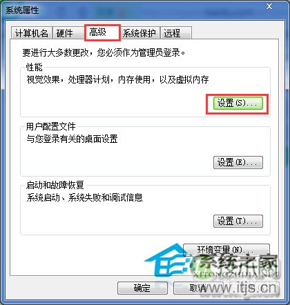3、在系统属性窗口中,选择“高级”选项卡。点击“性能”下面的“设置”按钮。如图: