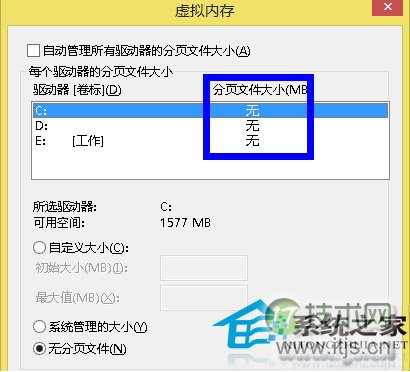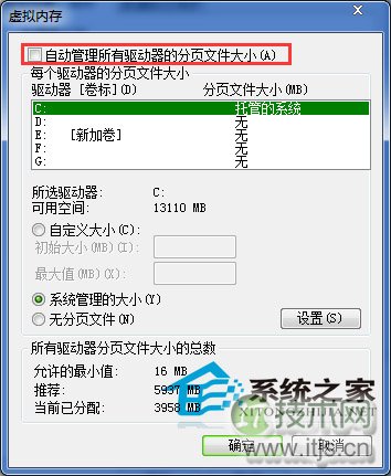 5、在“虚拟内存”窗口中,取消“自动管理所有驱动器分页文件大小”,如图: