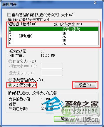 6、然后选中要删除磁盘中的分页文件,选择“无分页文件”,再点击“设置”,如图:
