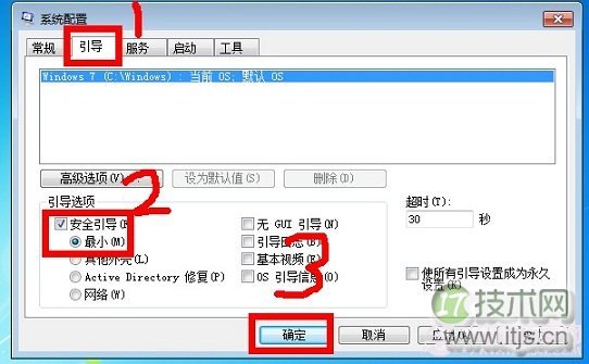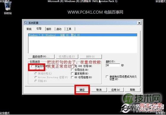 3、以上设置完后之后,我们重启系统就会自动进去安全模式了,假如要退出安全模式的话,按如上步骤,把安全引导的勾给取消就OK即可,如下图: