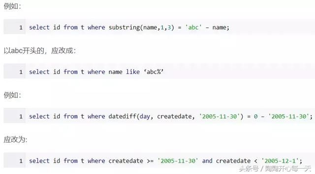 8、不要在 where 子句中的 “=” 左边进行函数、算术运算或其他表达式运算,否则系统将可能无法正确使用索引;
