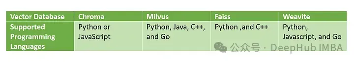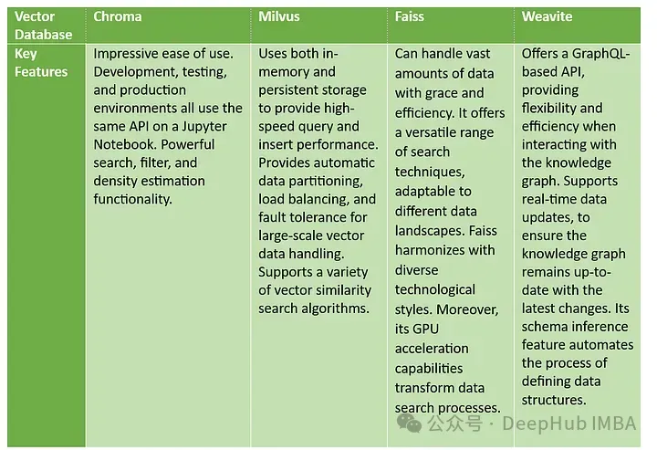 Chroma擅长处理多媒体内容,Milvus 提供通用的数据处理能力且特别适合于推荐系统和语言/视觉分析,Faiss 强调其 GPU 加速在搜索上的优势,而 Weaviate 则以其在企业级数据管理中的应用为特色。