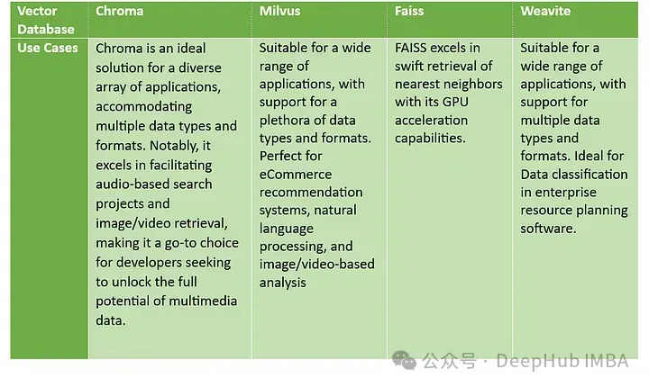 易用性: Chroma 强调在 Jupyter Notebook 上的易用性,而 Weaviate 则强调其 GraphQL API 的灵活性和效率。存储与性能: Milvus 在存储和查询性能方面提供了内存与持久存储的结合,相比之下,Faiss 强调 GPU 加速能力在搜索过程中的作用。数据处理与更新: Milvus 提供自动数据分区和容错,Weaviate 支持实时数据更新,确保数据的时效性。搜索技术: Chroma 和 Milvus 都提到了它们对搜索算法的支持,而 Faiss 则提供了适应不同技术风格的搜索技术,Weaviate 使用 GraphQL 提高了数据结构定义的效率。3、使用案例