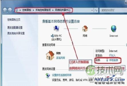 2、下协议进入控制面板的安装网络共享中心,查看本地连接。法图