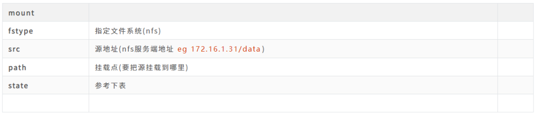 web01把 nfs共享的化运目录/data目录挂载到 web01的/upload_video 步骤01_web01上面创建挂载点/upload_video ansible web -m file -a path=/upload_video state=directory 步骤02_挂载nfs ansible web -m mount -a fstype=nfs src="172.16.1.31:/data" path=/upload_video state=mounted ansible web -a df -h ansible web -a tail -2 /etc/fstab2)cron定时任务模块