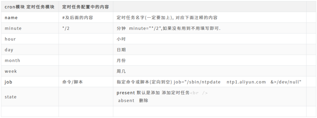 #简单粗暴版本 --- - hosts: all tasks: - name: add cron sync time cron: name="sync time by lidao996 20221111" minute="*/2" job="/sbin/ntpdate ntp1.aliyun.com &>/dev/null" state=present #格式优化后 --- - hosts: all tasks: - name: add cron sync time cron: name: "sync time by lidao996 20221111" minute: "*/2" job: "/sbin/ntpdate ntp1.aliyun.com &>/dev/null" state: present在剧本中使用模块和选项,选项最好是一行一个选项,选项后面跟着冒号,选项要对其与缩进。