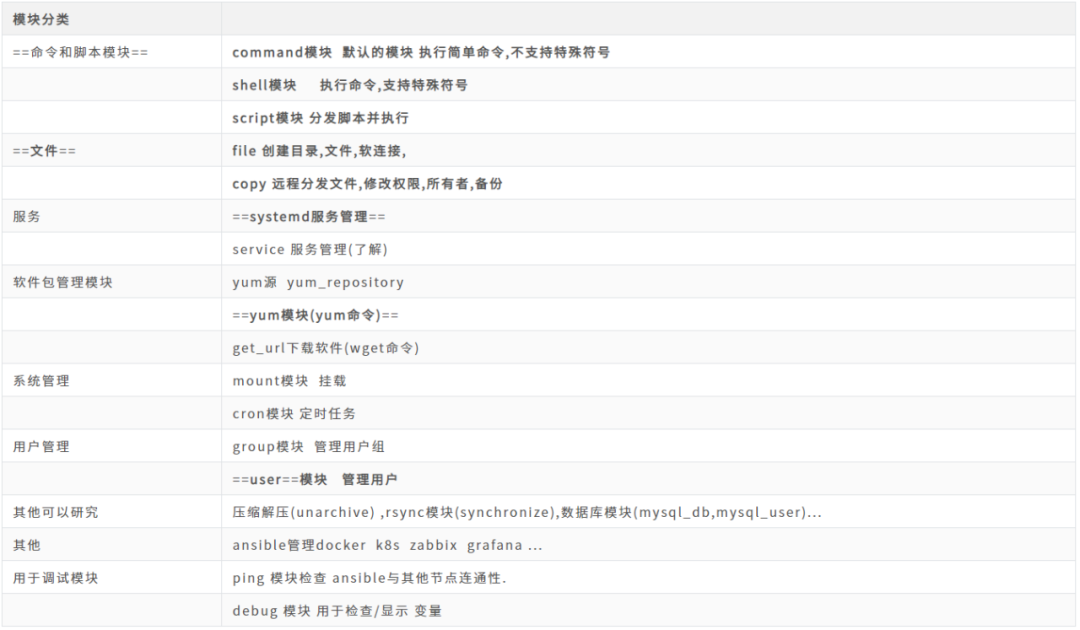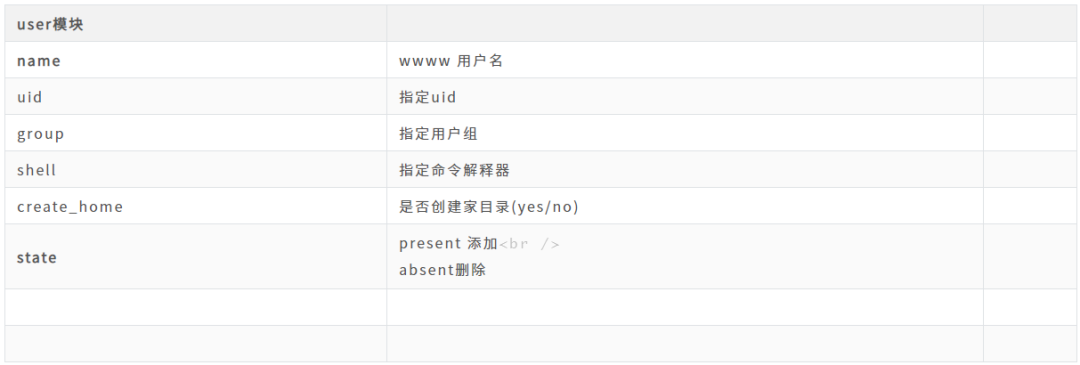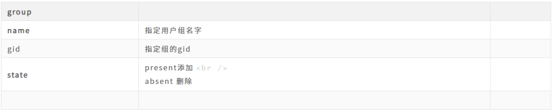useradd -u 10086 -s /sbin/nologin -M tengine [root@m01 ~]# ansible web -m user -a name=tengine uid=10086 shell=/sbin/nologin create_home=no state=present 172.16.1.7 | CHANGED => { "ansible_facts": { "discovered_interpreter_python": "/usr/bin/python" }, "changed": true, "comment": "", "create_home": false, "group": 10086, "home": "/home/tengine", "name": "tengine", "shell": "/sbin/nologin", "state": "present", "system": false, "uid": 10086 } [root@m01 ~]# ansible web -a id tengine 172.16.1.7 | CHANGED | rc=0 >> uid=10086(tengine) gid=10086(tengine) groups=10086(tengine) [root@m01 ~]# ansible web -a grep tengine /etc/passwd 172.16.1.7 | CHANGED | rc=0 >> tengine:x:10086:10086::/home/tengine:/sbin/nologin2)group模块
