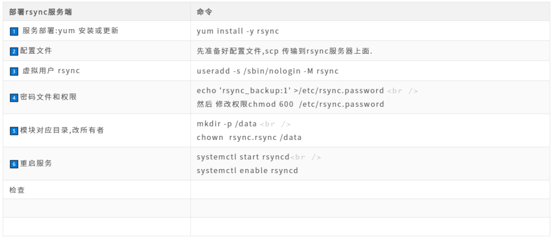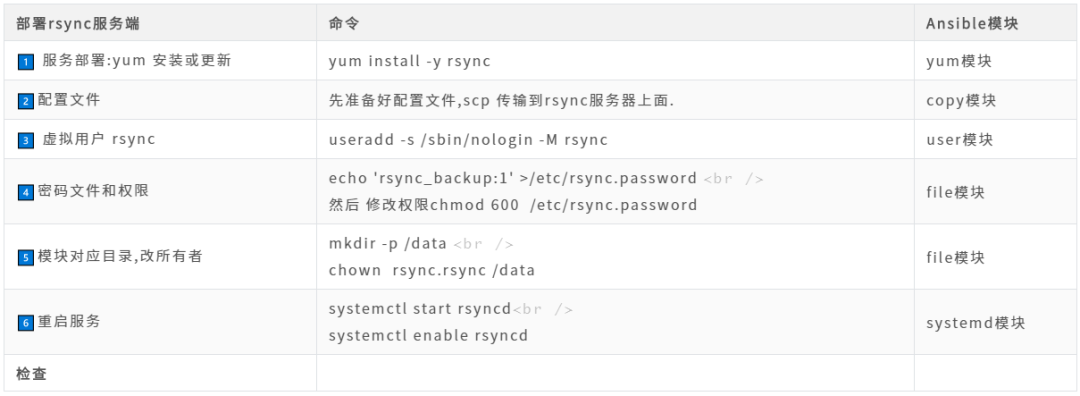 --- - hosts: all tasks: - name: 1. download zabbix agent2 rpm get_url: ur : https://mirrors.tuna.tsinghua.edu.cn/zabbix/zabbix/6.0/rhel/7/x86_64/zabbix-agent2-6.0.0-1.el7.x86_64.rpm dest: /tmp/ validate_certs: no - name: 2. install zabbix agent2 rpm yu : name: /tmp/zabbix-agent2-6.0.0-1.el7.x86_64.rpm state: installed - name: 3. start zabbix agent2 service s stemd: name: zabbix-agent2 enabled: yes state: started案例04-部署rsync服务端(剧本)