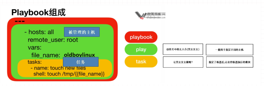 [root@m01 /server/ans/playbook]# cat 07.vars_dir.yml --- - hosts: all vars: dir_name: /oldboy_lidao file_name: lidao996.icu tasks: - name: 01. mkdir file: path: "{{ dir_name}}" state: directory - name: 02. touch file: path: "{{ dir_name}}/{{ file_name}}" state: touch把变量存放到一个文件中. 剧本比较大的时候.