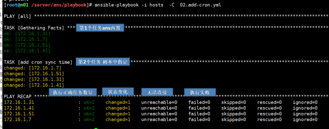 [root@m01 /server/ans/playbook]# cat 01.touch.yml - hosts: all vars: filename: lidao.txt tasks: - name: touch file shell: touch /tmp/{{ filename}} cp /etc/ansible/hosts . ansible-playbook -i hosts 01.touch.yml [root@m01 /server/ans/playbook]# tree /server/ans/playbook/ /server/ans/playbook/ ├── 01.touch.yml └── hosts 0 directories, 2 files - hosts: all tasks: - name: touch file shell: touch /tmp/lida.txt案例02-添加定时同步时间的定时任务