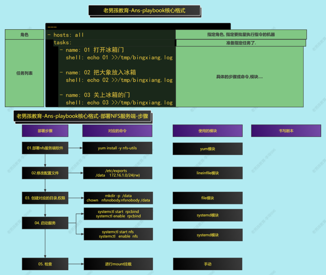 [root@m01 /server/ans/playbook]# cat 13-debug-nfs-server.yml --- - hosts: db tasks: - name: 01. 部署nfs服务端软件 yum: name: nfs-utils state: installed - name: 02. 修改配置文件 lineinfile: path: /etc/exports line: "/data 172.16.1.0/24(rw)" state: present backup: yes - name: 03. 创建对应的目录,权限 file: path: /data/ owner: nfsnobody group: nfsnobody state: directory register: file_jieguo - name: 输出,显示这个过程 debug: msg: "{{ file_jieguo}}" - name: 04. 启动服务-rpc服务 systemd: name: rpcbind enabled: yes state: started - name: 05. 启动服务-nfs服务 systemd: name: nfs enabled: yes state: startedtags标签