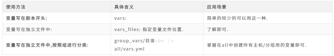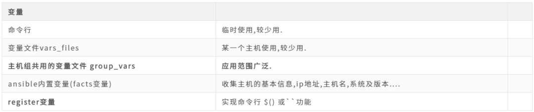 [root@m01 /server/ans/playbook]# tree group_vars/ group_vars/ ├── all │ └── vars.yml ├── data │ └── vars.yml └── web └── vars.yml 3 directories, 3 files [root@m01 /server/ans/playbook]# cat group_vars/all/vars.yml dir_name_code: /app/code/ dir_name_data: /data/ [root@m01 /server/ans/playbook]# cat 09.vars_group_vars_dir.yml - hosts: all tasks: - name: 01 {{ dir_name_code}} file: path: "{{ dir_name_code}}" state: directory - name: 02 {{ dir_name_data}} file: path: "{{ dir_name_data}}" state: directory 剧本目录,目录结构 [root@m01 /server/ans/playbook]# tree . ├── 01.touch.yml ├── 02.add-cron.yml ├── 03.add-cron-you.yml ├── 04.install-zabbix-agent2.yml ├── 05-backup-resyncd.yml ├── 06-nfs-server.yml ├── 07.vars_dir.yml ├── 08.vars_files_dir.yml ├── 09.vars_group_vars_dir.yml ├── group_vars │ ├── all │ │ └── vars.yml │ ├── data │ │ └── vars.yml │ └── web │ └── vars.yml ├── hosts ├── rsyncd.conf └── vars.yml 4 directories, 15 files变量基础定义小结