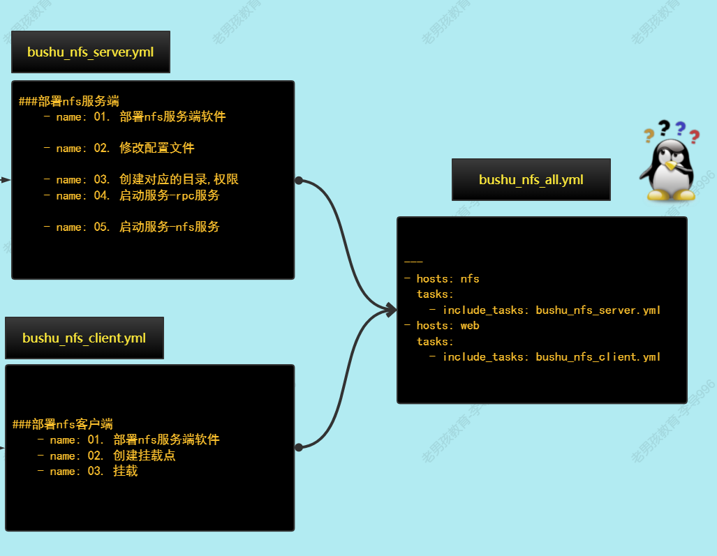 [root@m01 /server/ans/playbook]# cat 15-ignore-nfs-server.yml --- - hosts: db tasks: - name: 01. 部署nfs服务端软件 yum: name: nfs-util state: installed ignore_errors: yes tags: - install - name: 02. 修改配置文件 lineinfile: path: /etc/exports line: "/data 172.16.1.0/24(rw)" state: present backup: yes tags: - conf - conf_file - name: 03. 创建对应的目录,权限 file: path: /data/ owner: nfsnobody group: nfsnobody state: directory tags: - conf - conf_dir - name: 04. 启动服务-rpc服务 systemd: name: rpcbind enabled: yes state: started tags: - start_srv - name: 05. 启动服务-nfs服务 systemd: name: nfs enabled: yes state: started tags: - start_srvAnsible-进阶应用