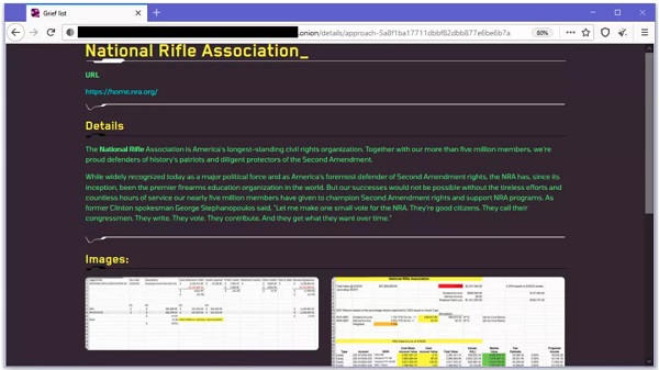 日前,美国勒索软件团伙Grief声称已在一次攻击中“命中”美国全国步枪协会(NRA)。全国NRA的步枪名称被列在一个暗网泄密网站上(见下图),Grief团伙通常会在其中列出他们感染的遭勒企业并且标注支付赎金要求。