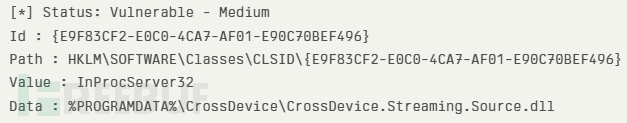 漏洞利用过程面临多项技术挑战。洞毫研究人员最初使用 PrivescCheck 工具进行自动化扫描,发现非特权用户对 COM 服务器模块文件具有修改权限: