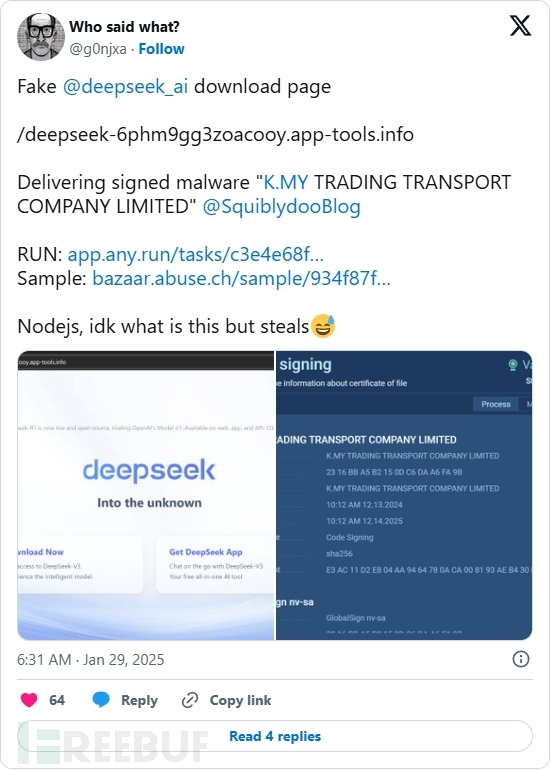 DDoS攻击:RapperBot支持多种DDoS攻击方式,包括TCP STOMP攻击、UDP泛洪攻击等,能够对非HTTP目标发起攻击。持久化访问:成功入侵后,RapperBot会替换受害设备的~/.ssh/authorized_keys文件,并创建一个名为“suhelper”的超级用户账户,以此确保对设备的持久访问。除了针对性的网络攻击,DeepSeek同样也成了黑产眼中的“肥肉”,大量网络犯罪分子发布山寨版本来传播恶意软件,或骗取用户的订阅费用。例如ESET就曾发现,/deepseek-6phm9gg3zoacooy.app-tools.info网站传播被标识为Win32/Packed.NSIS.A的恶意软件。由于该恶意软件经过数字签名,因此更具欺骗性,容易让毫无戒心的用户放松警惕。