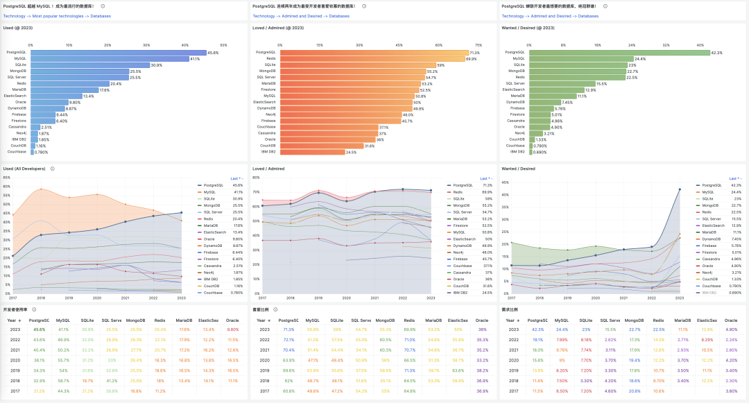 2023 年 StackOverflow 调研结果已经新鲜出炉,来自185个国家与地区的9万名开发者给出了高质量的反馈。在今年的调研中,PostgreSQL 在数据库全部三项调研指标流行度,喜爱度,需
